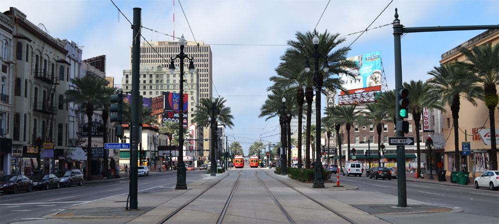 We lopen vanaf de parkeergarage Canal St op, een grote brede straat met van die rare treintjes die op en neer rijden (en afgeladen zijn met mensen).