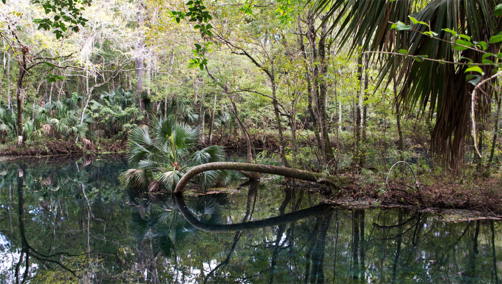 We pakken een alternatief pad en komen uit bij een brugje dat over een stuk water loopt. Ook hier is het water heel erg helder en is heel goed te zien op de bodem dat er een hoop water opborrelt. In het water zien we ook onze eerste alligator van de dag en een paar schildpadden.